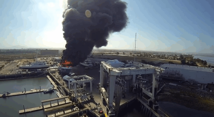 Частный беспилотный вертолет заснял, как в пригороде калифорнийского Сан-Диего сгорела дорогая яхта. Курт Ролл, который в тот момент снимал на видео яхту друга, заметил облако черного дыма и отправил свой беспилотный вертолет к месту событий.
