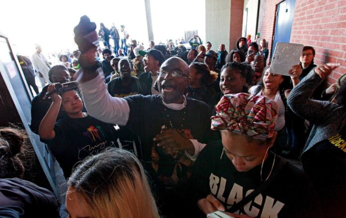 Как сообщается, некоторые из протестующих разбивали молотками окна магазинов. Толпа ведет себя достаточно агрессивно.