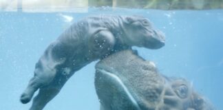 В зоопарке Сан-Диего новорождённого гиппопотама учат плавать
